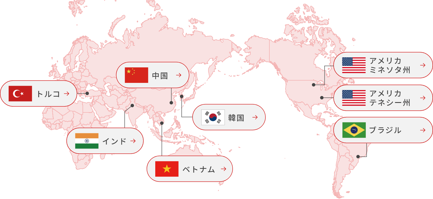 現在、アメリカ・韓国・トルコ・中国・インド・ベトナム・ブラジルの7カ国に生産拠点を設置するなど、日本はもとより全世界に高品質の製品を供給できる体制を構築。