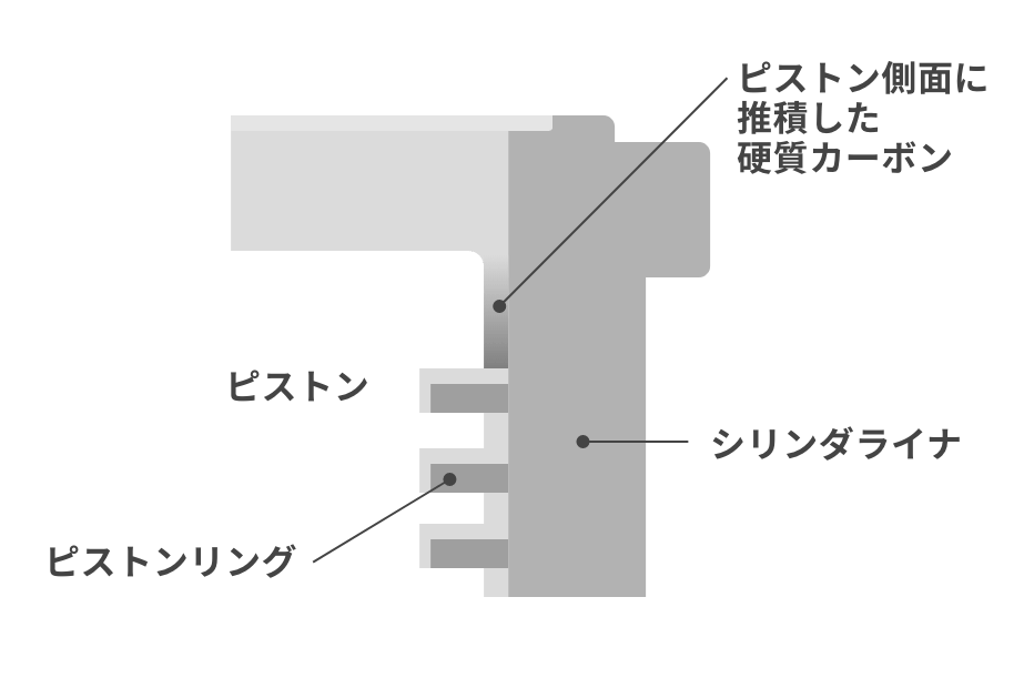 - ピストンに堆積した硬質カーボンはピストン上昇時にスクレーパリングによって掻き落とされる。